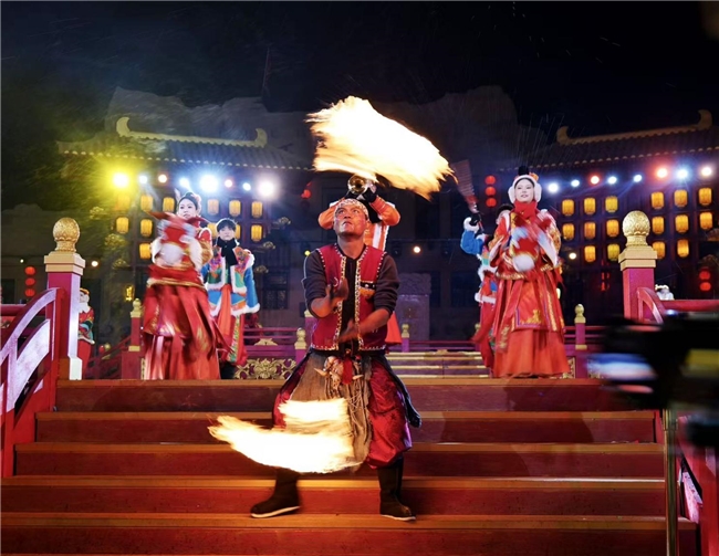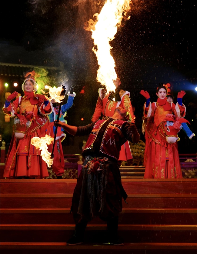 夜幕降临,傩戏与现代火舞在广场中央跨界融合。表演者口吐烈焰,火把在夜空中划出绚丽轨迹,原始野性与艺术惊艳交织。观众们屏息凝神,待火焰熄灭,掌声与欢呼声如山呼海啸般响起。一旁的非遗杂技区,飞刀绝技、吞剑拉车等绝活轮番上演,每一幕惊险都引来阵阵尖叫。